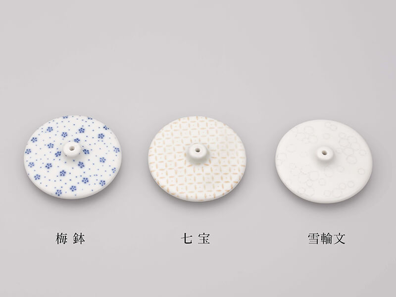 本体色と柄の組み合わせは通常、金色には「七宝」、銀色には「梅鉢」、焼朱銅色には「雪輪文」となっております。